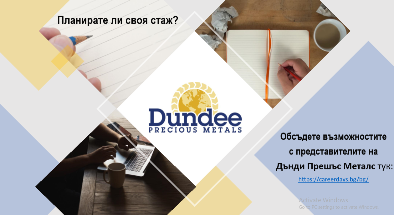 От днес до 26 март се провежда най-голямото кариерно изложение и първите по рода си „Виртуални национални дни на кариерата“. На 26 март „Дънди Прешъс Металс Челопеч“ ЕАД и „Дънди Прешъс Металс Крумовград“ ЕАД ще представят и обсъдят възможностите за стаж с всички желаещи да надградят знанията си и да натрупат практически опит. Регистрирайте се…