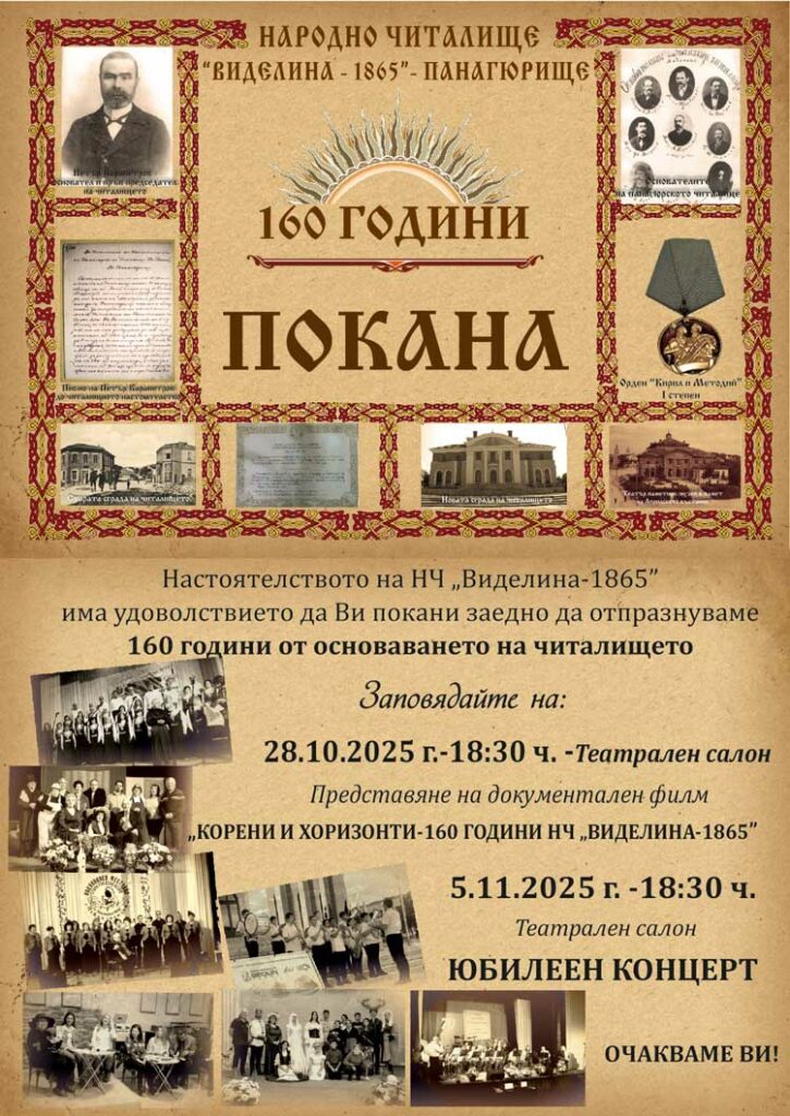 Настоятелството на Народно читалище „Виделина-1865”, гр. Панагюрище кани всички жители и гости на града да отбележим заедно юбилея на културната институция.