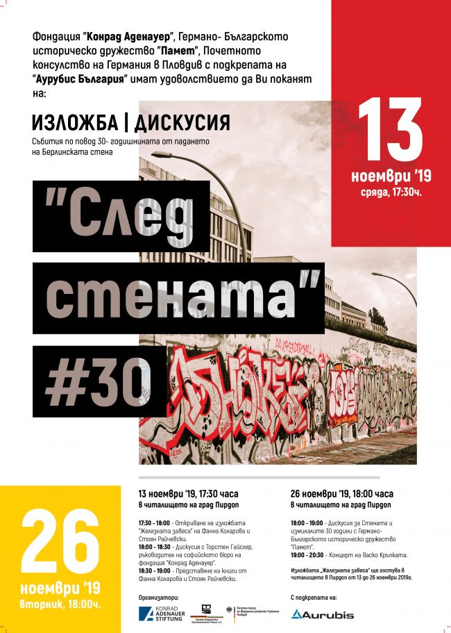 Българо-германското историческо дружество „Памет”, Почетното консулство на Федерална република Германия в Пловдив, Фондация „Конрад Аденауер” организират с подкрепата на „Аурубис България” на 13 ноември 2019 г., сряда, в 17.30 ч., в читалището на град Пирдоп, Софийска област изложба и дискусия на тема „След стената. 30 години по-късно”. Автори на изложбата „Желязната завеса” са г-жа Фанна…