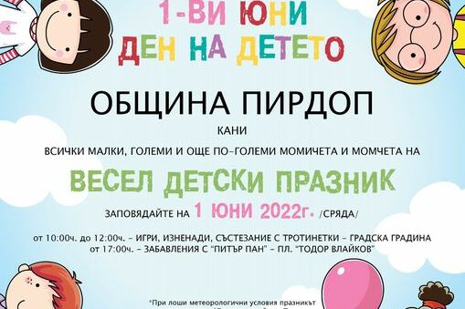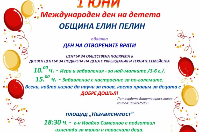 На 1 ЮНИ – Международен ден на детето Община Елин Пелин обявява ДЕН НА ОТВОРЕНИТЕ ВРАТИ в Център за обществена подкрепа и Дневен център за…
