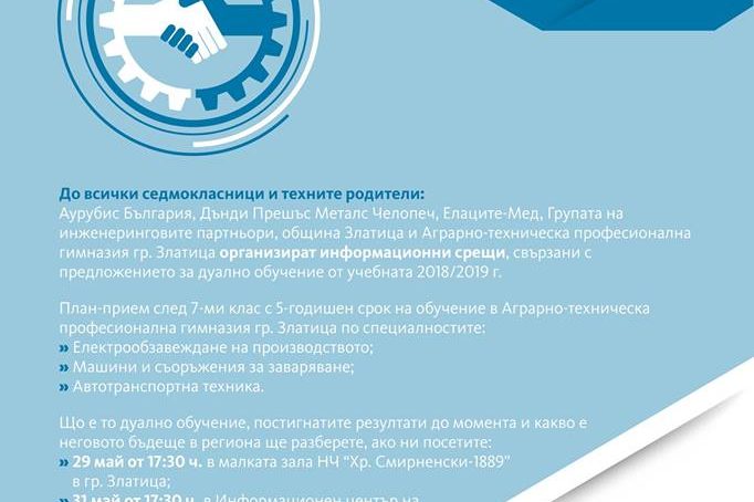 В информационния център на „Аурубис България” в Пирдоп се състоя среща за запознаване на обществеността с дуалната форма на обучение в Аграрно-техническа професионална гимназия –…